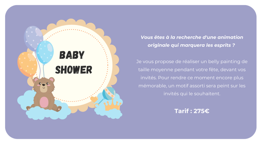 Forme d’art créatif aidant à la création de votre lien personnel entre vous et votre futur bébé. C’est un moment relaxant et amusant de profiter de cette osmose avec bébé et de créer un souvenir spécial qui peut être partagé avec votre famille et vos amis.