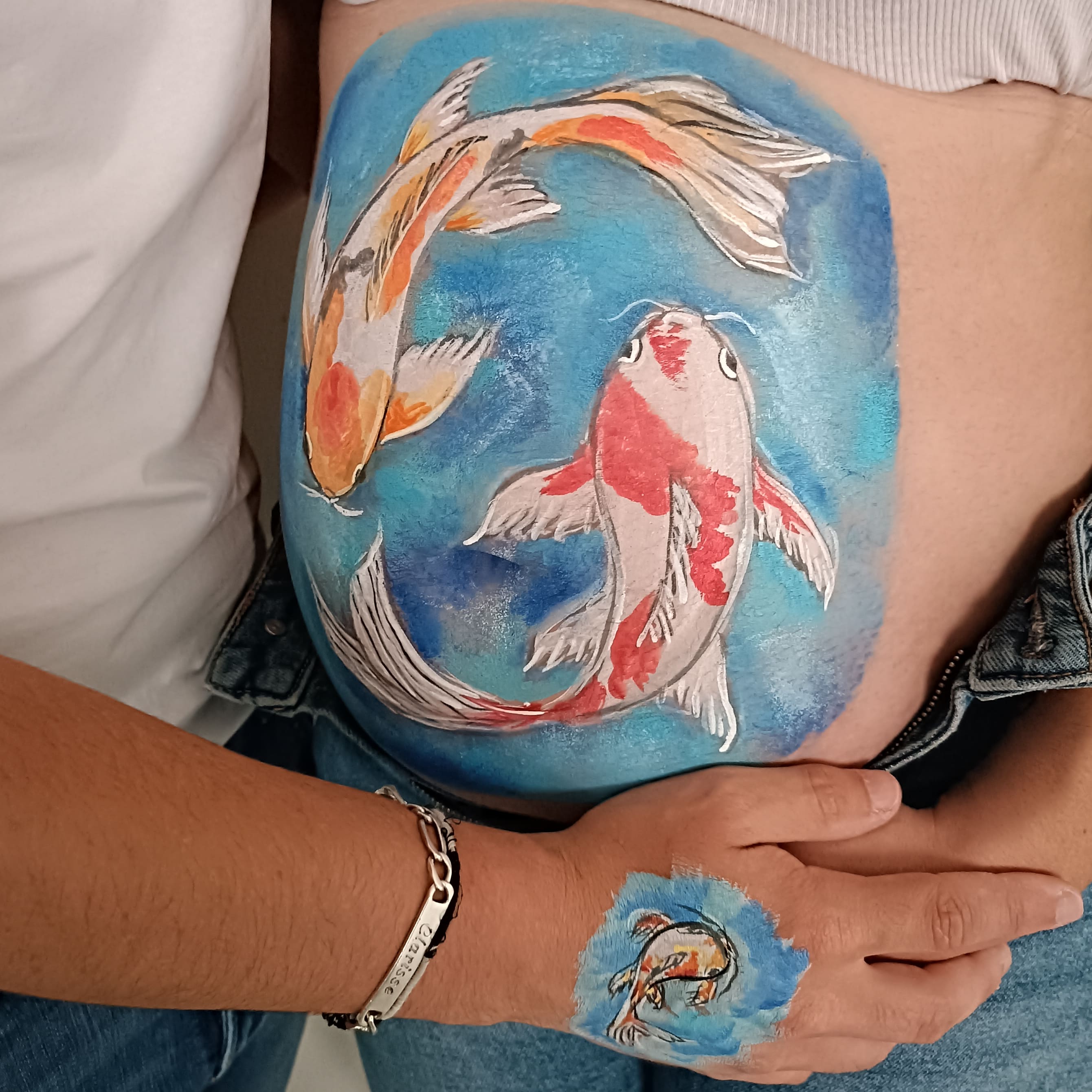 Prénom sur la main ou l’avant bras avec un petit motif de rappel du belly painting.